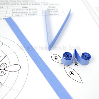Just like the patterns I designed in my book, Pretty Quilled Cards, you won't need to reach for a ruler to measure the length. Simply place your strip on top of my guides and trim to the right length. Dotted lines indicate where you'll need to fold.