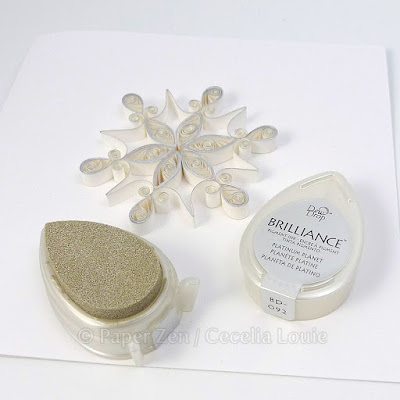 Ever been tempted to buy pre-made silver edged quilling strips? There's really no need if you have a metallic silver ink pad – simply dab it on top when you're finished. When it's been gilded with silver, it just looks so chic!